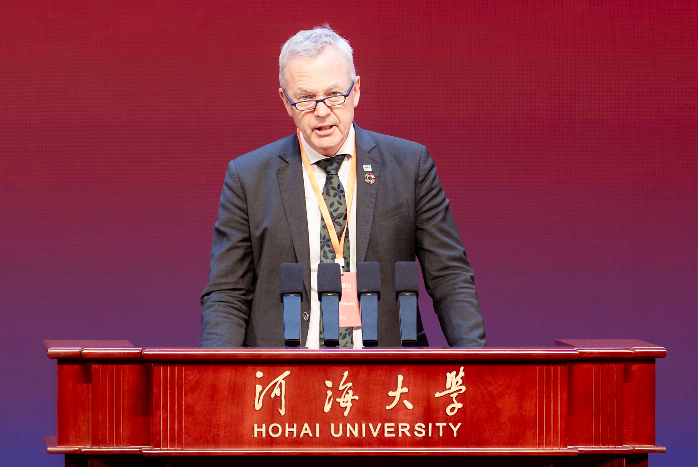 Eddy Moors, President of IHE Delft, delivered a speech as a representative of foreign universities. He stated that Hohai University, as one of the earliest higher education institutions in China to focus on the field of water conservancy, has made profound contributions to the sustainable development of China's rivers, lakes, and estuaries, and has powerfully promoted the progress of global water science; both the Netherlands and China are countries that thrive on water, and it is precisely because of the shared spirit of unity and cooperation that the collaboration between Hohai University and Dutch universities has transcended time and yielded fruitful results. On the occasion of celebrating the 110th anniversary of Hohai University, he hoped that Hohai University and IHE Delft would join hands to continue to promote the innovative development of water science, cultivate future leading talent in the field of water conservancy, and jointly build a more resilient and sustainable global home.